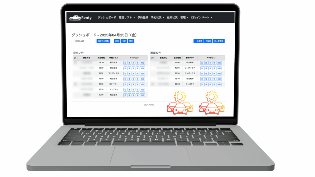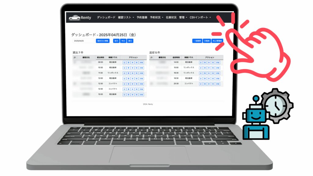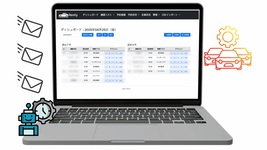 Rentyは、予約・在庫・連絡のすべてを“誰でも回せる仕組み”に変えます。だから、スタッフが変わっても、業務が止まりません。操作も覚える内容も最小限。ミスが起きにくいよう、人の手を最小限に抑えた設計です。