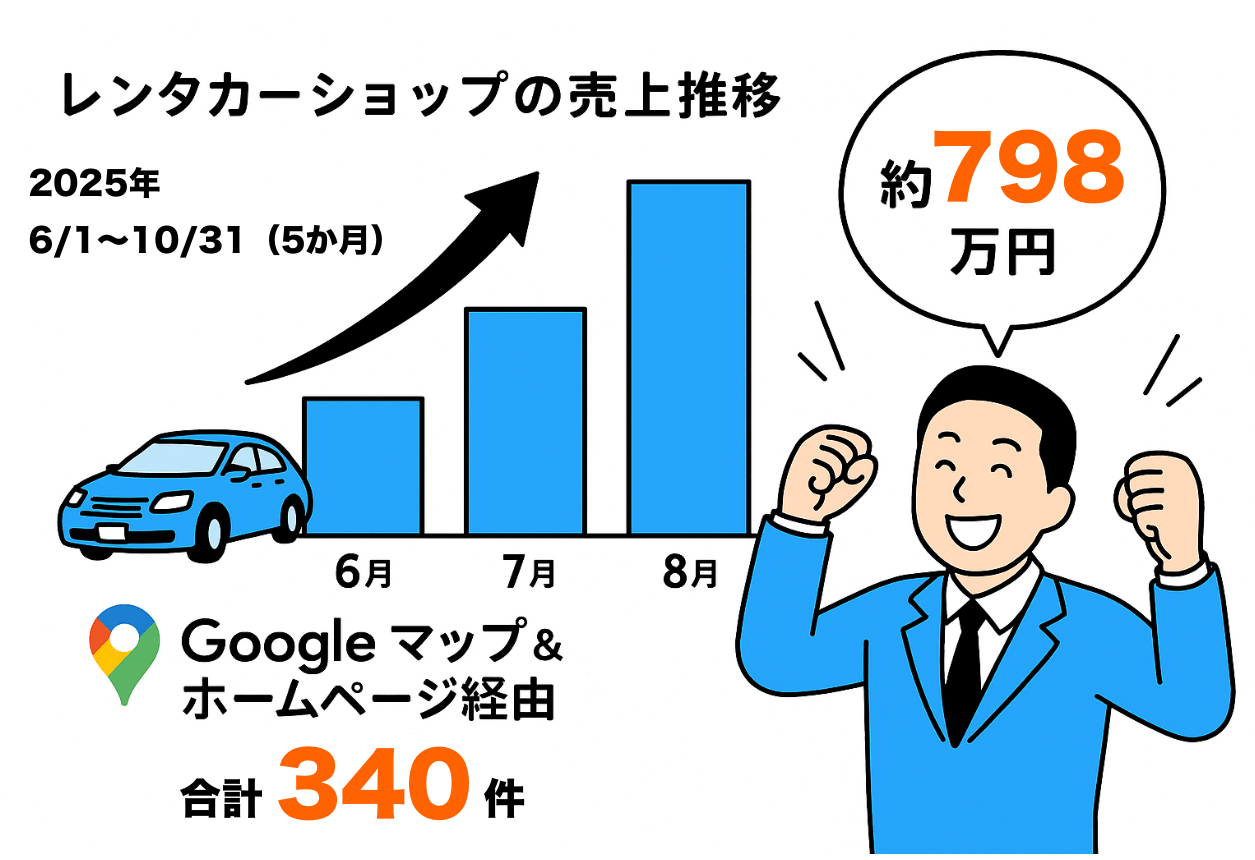 そしてブルーレンタカーでは、店舗直接予約+自社サイト経由だけで、たった5ヶ月で340件・約798万円の売上を達成。広告費ゼロで、しっかり利益が残る予約が毎月コンスタントに入っています。だからこそ...
